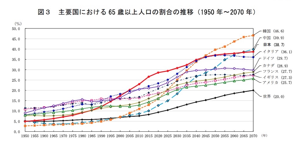 敬老の日に合わせて総務省が高齢者に特化した統計データを発表。9月現在で日本国内の65歳以上の高齢者数は3,619万人。全人口のうち29.4%が高齢者に相当する。高齢者比率では世界1位としている。高齢者比率は次50年と右肩上がりで2070年ころには全人口のうち38.7%が高齢者になる見通し。