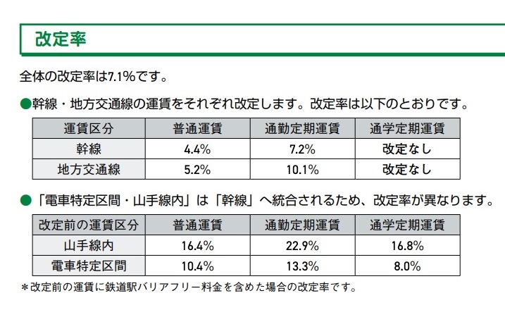 3月14日より運賃改定。エリア全体の値上げ幅は7.1%だが、山手線内に限ると16.4%、首都圏エリアに限ると10.4%の値上がり。都市部エリアの割安運賃を実現してきた「山手線」「電車特定区間」の区分を廃止。今後は他のエリア同様に「幹線」区分となり、走行距離(営業キロ)に応じた運賃が発生する。