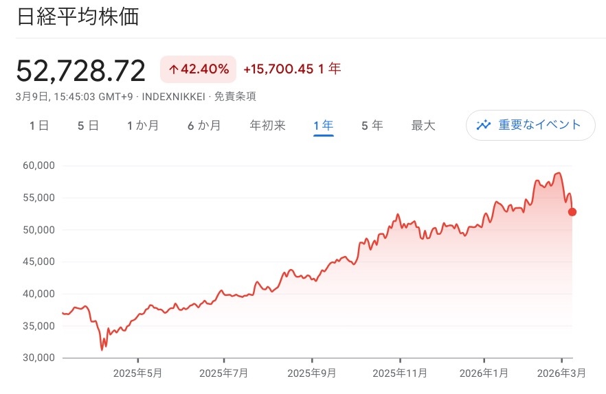 2月27日時点で過去最高値となる58,850円を記録していたが、アメリカのイラン攻撃が始まった28日以降に急落。9日時点で終値52,728円に。トランプ大統領は軍事作戦は4週間近く続くとの認識を示しており、原油価格は4年ぶり最高値ペースで推移。企業業績や物価高への懸念が広がる。